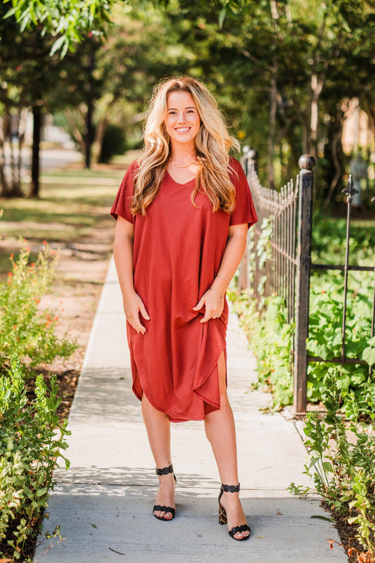 Red Brown V-Neck T-Shirt Dress