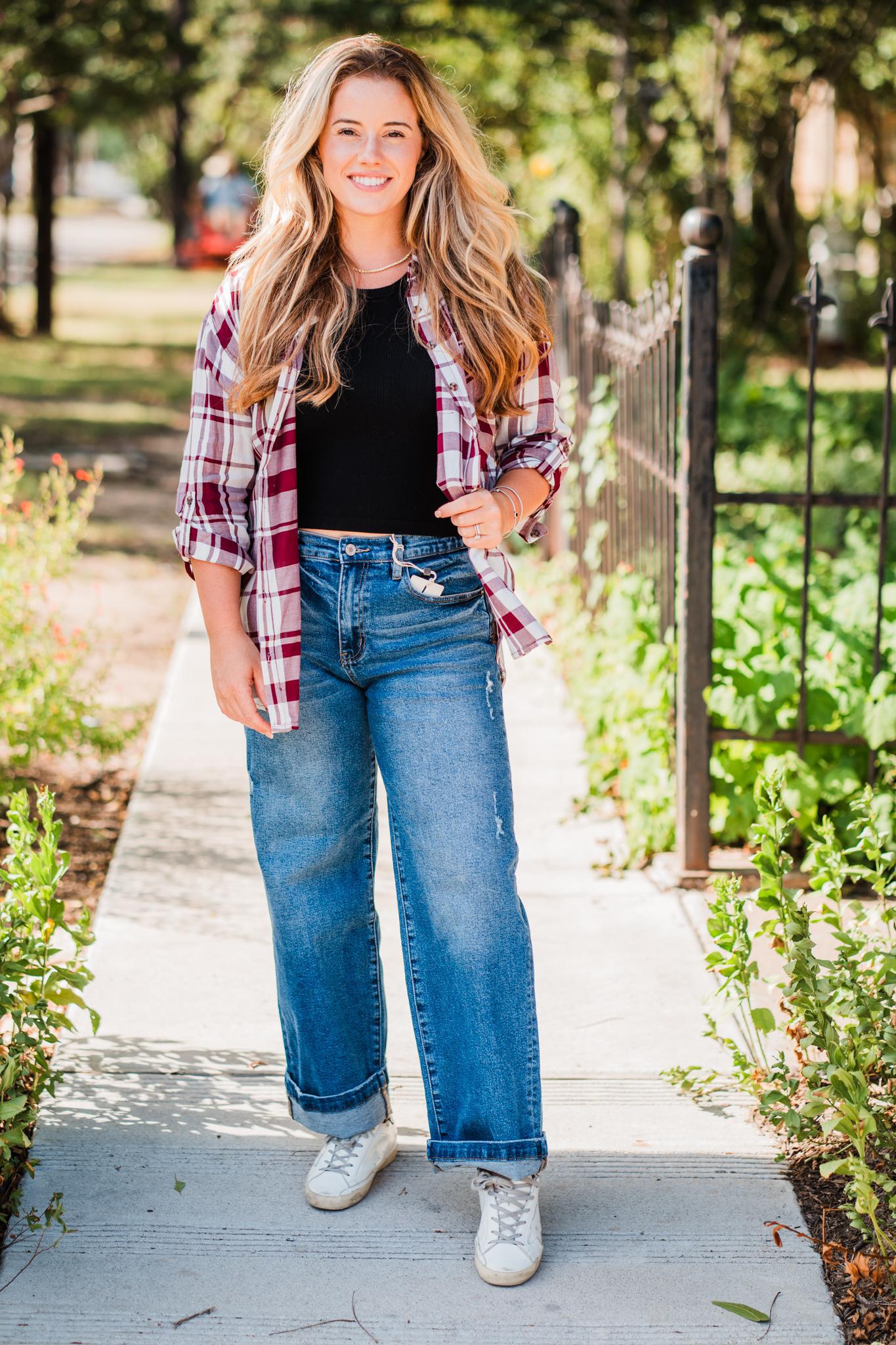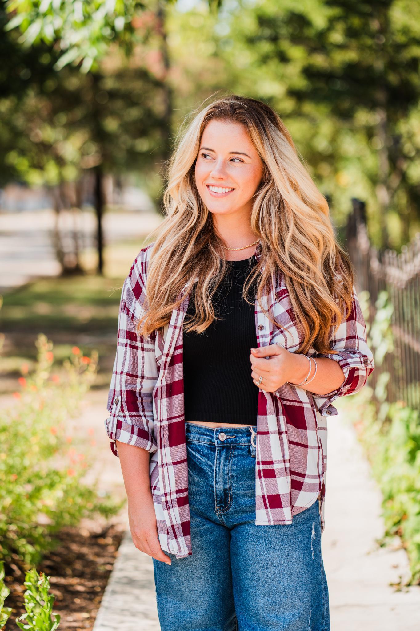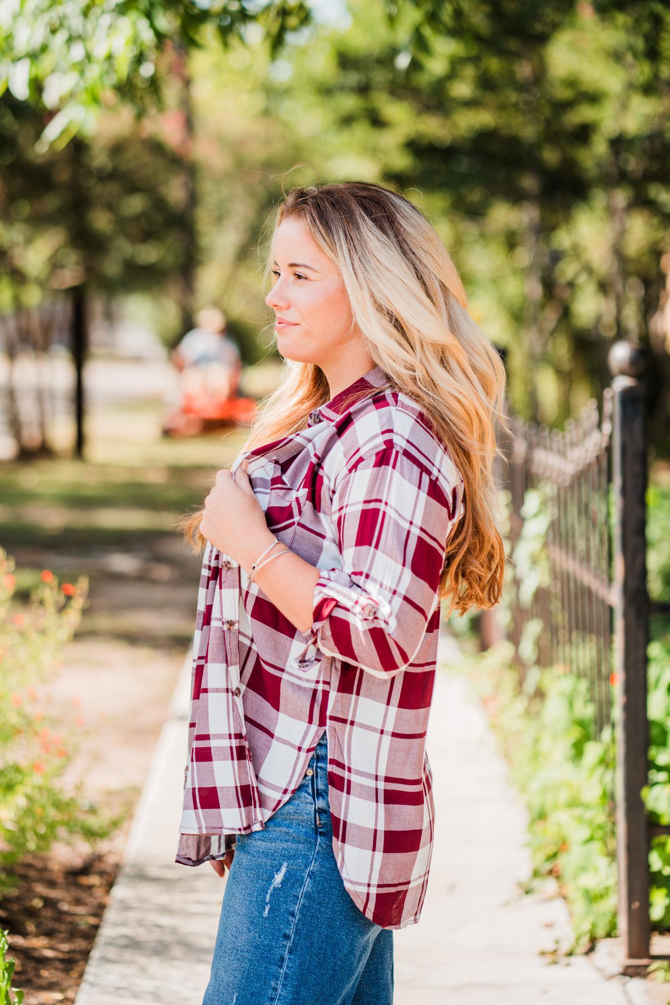 High-Low Long Sleeve Plaid Lightweight Shirt with Button-Down Front and Single Pocket Featuring Side Slits.