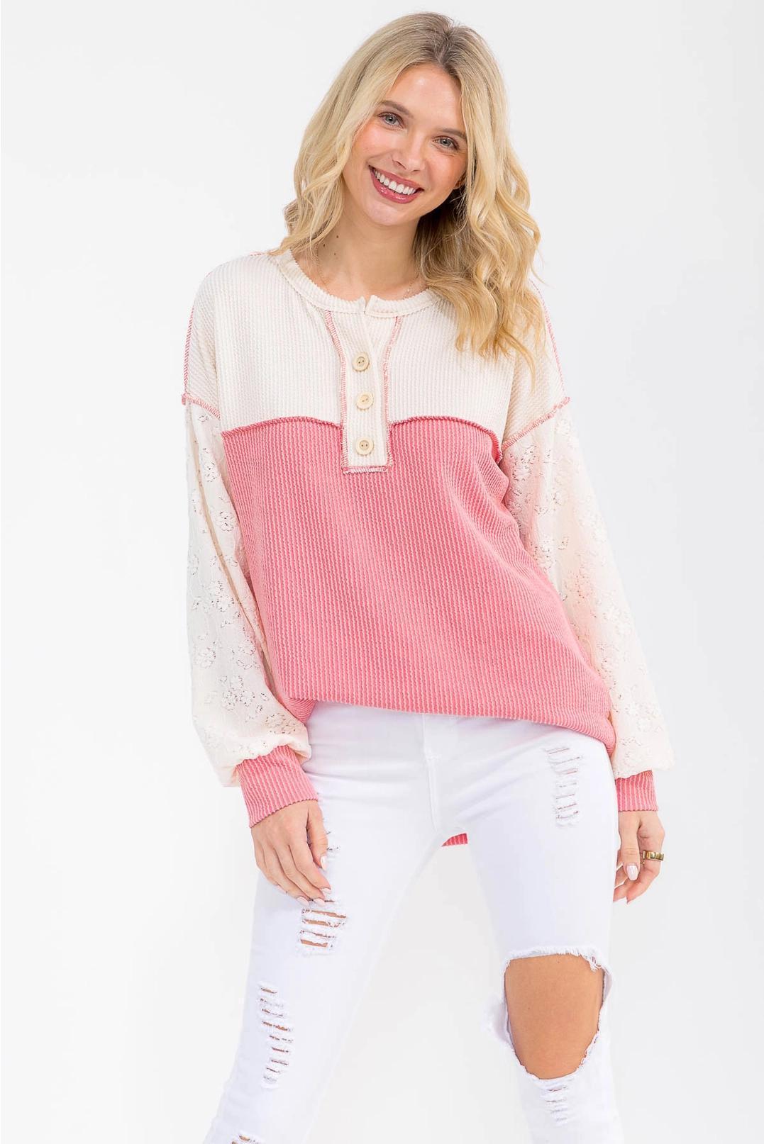 Coral Two Tone Rib Knit Lace Sleeve Henley Top