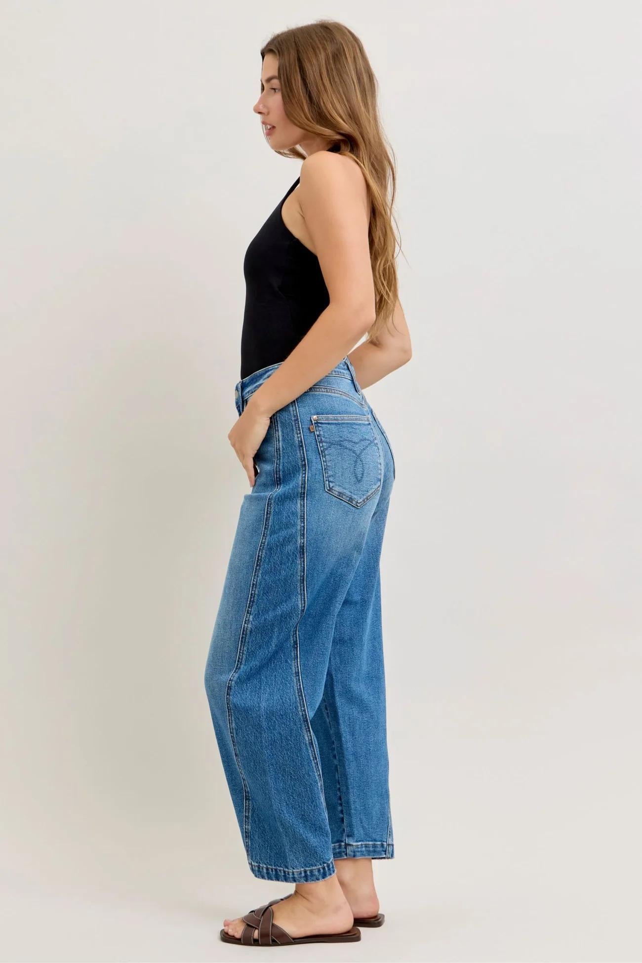 The Judy Blue Rigid Magic barrel jeans are high-waist barrel denim jeans with a relaxed, slightly rounded leg and unique seam details. They feature "Rigid Magic" fabric, which combines the look of rigid 100% cotton denim in the front panel with a comfortable stretch material in the back panel.