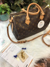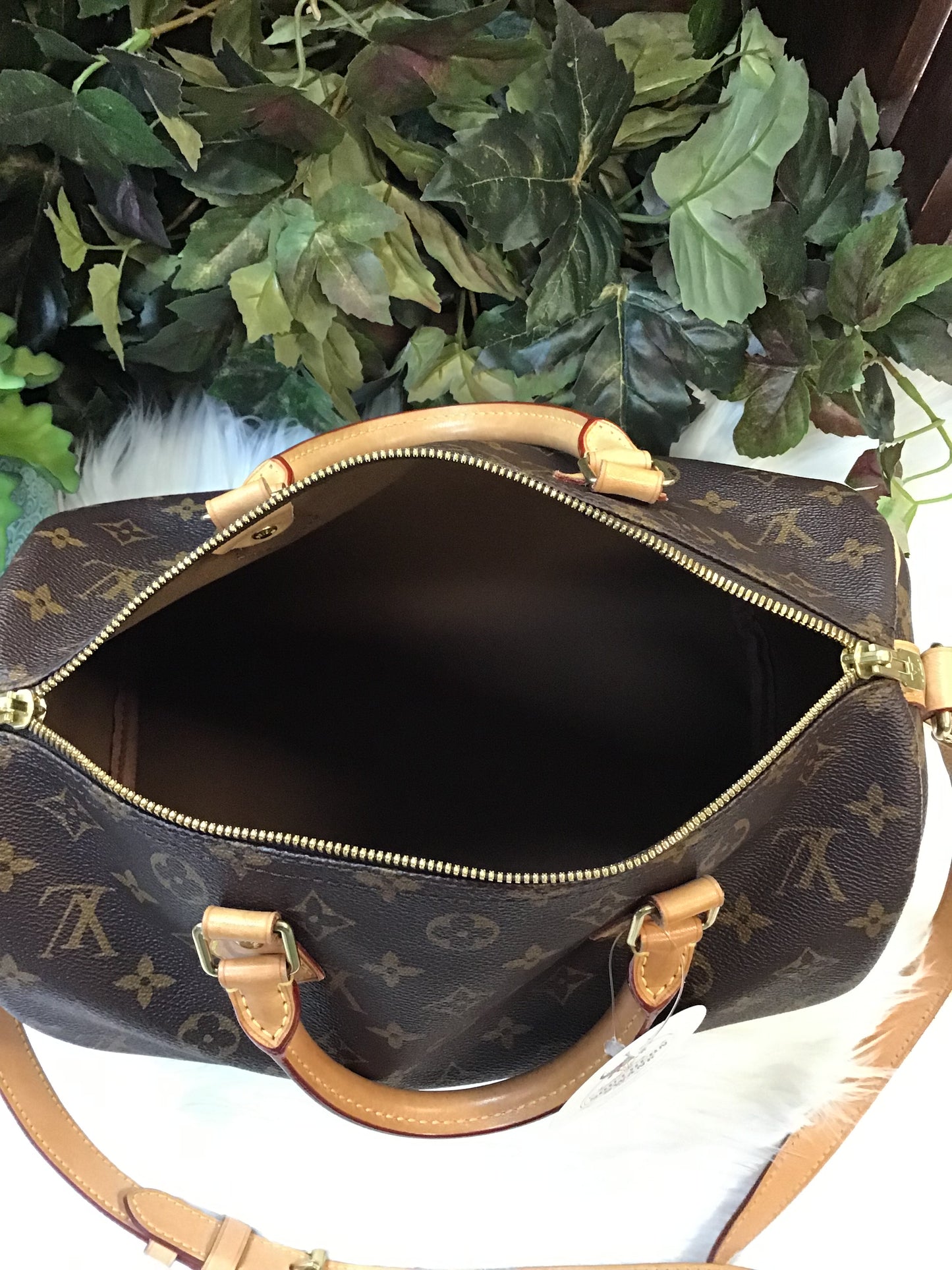 DETAILS: This Louis Vuitton Speedy Bandouliere 30 is always in fashion and suitable for a variety of occasions. Simple and easy to carry, this handbag comes with adjustable authentic LV strap which makes getting around town with all the essentials a pleasure. The zip top is perfect for keeping all your items enclosed and the interior features a side pocket! This bag is a timeless handbag that is always on-trend, the Speedy Bandoulière 30 in Monogram canvas holds all the essentials for busy lifestyles. Originally created for travelers in the 1930s – the name refers to the era’s rapid transit – every feature of the Speedy’s design is iconic, from its unmistakable shape to the rolled leather handles, engraved padlock and detachable strap.