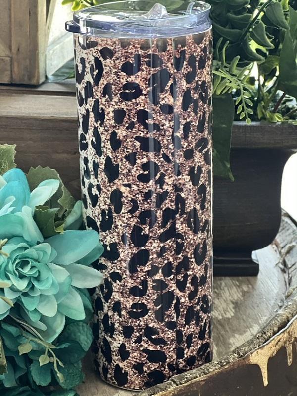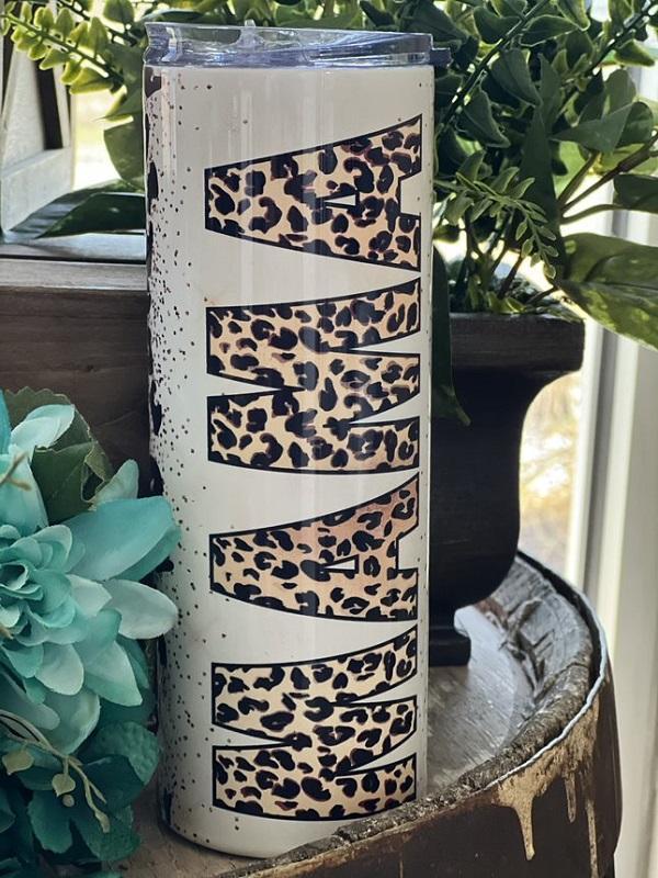 20oz Skinny leopard Mama sublimation tumbler comes with a metal straw.
